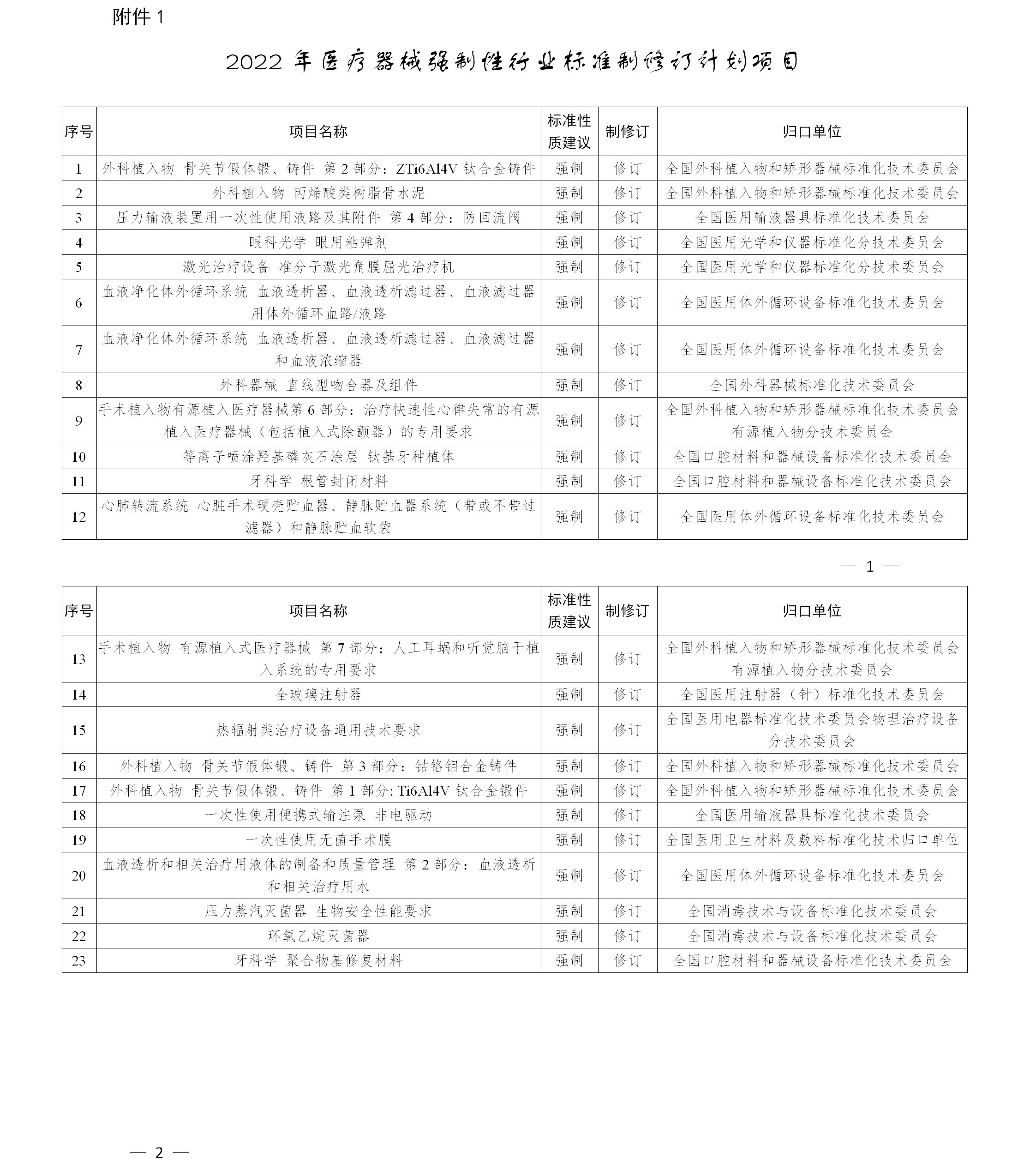 附件:1.2022年医疗器械强制性行业标准制修订计划项目 2.2022年医疗器械推荐性行业标准制修订计划项目